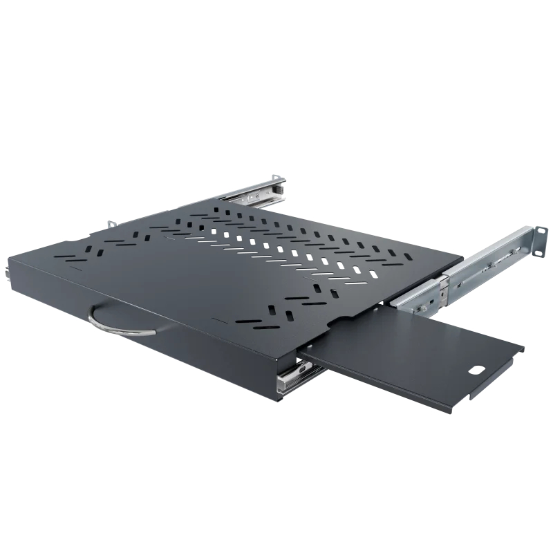 The Stalflex 19 inch 1U rack shelf is designed specifically for convenient placement of a keyboard and mouse in rack environments, creating a practical workstation directly within the cabinet. Its sliding design allows easy access during use while keeping the workspace compact and organized when not in use. This makes it an ideal solution for server rooms, network cabinets, and technical installations where space efficiency and accessibility are essential. With a standard 19 inch width and 1U height, the shelf integrates seamlessly into common rack systems. The adjustable mounting depth supports cabinets ranging from 450 mm to 610 mm, ensuring compatibility with a wide variety of rack configurations. This flexibility allows the shelf to be used in both new installations and existing setups without additional modifications.