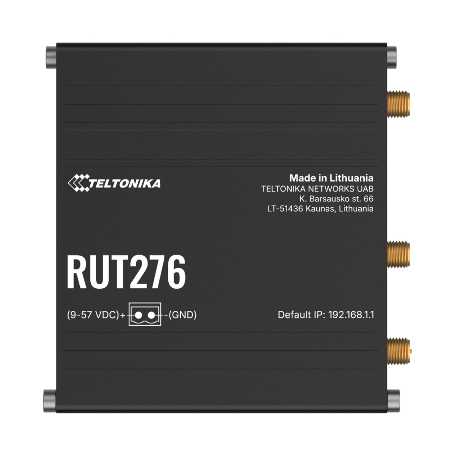 The RUT276 is built to operate reliably in demanding industrial environments, combining a compact form factor with a rugged aluminium enclosure that ensures durability, heat dissipation, and resistance to mechanical stress. Its design supports multiple mounting options, including DIN rail, wall mounting, and flat surface installation. The router is engineered for stable operation under varying power conditions, supporting a wide input voltage range of 9 to 57 VDC. Integrated protection mechanisms include reverse polarity protection and surge protection exceeding 58V (10 µs), safeguarding the device against electrical anomalies. In addition to a standard 2-pin industrial DC connector, the RUT276 supports both active PoE (802.3af Class 0) via the LAN port and passive PoE (16–57 VDC).